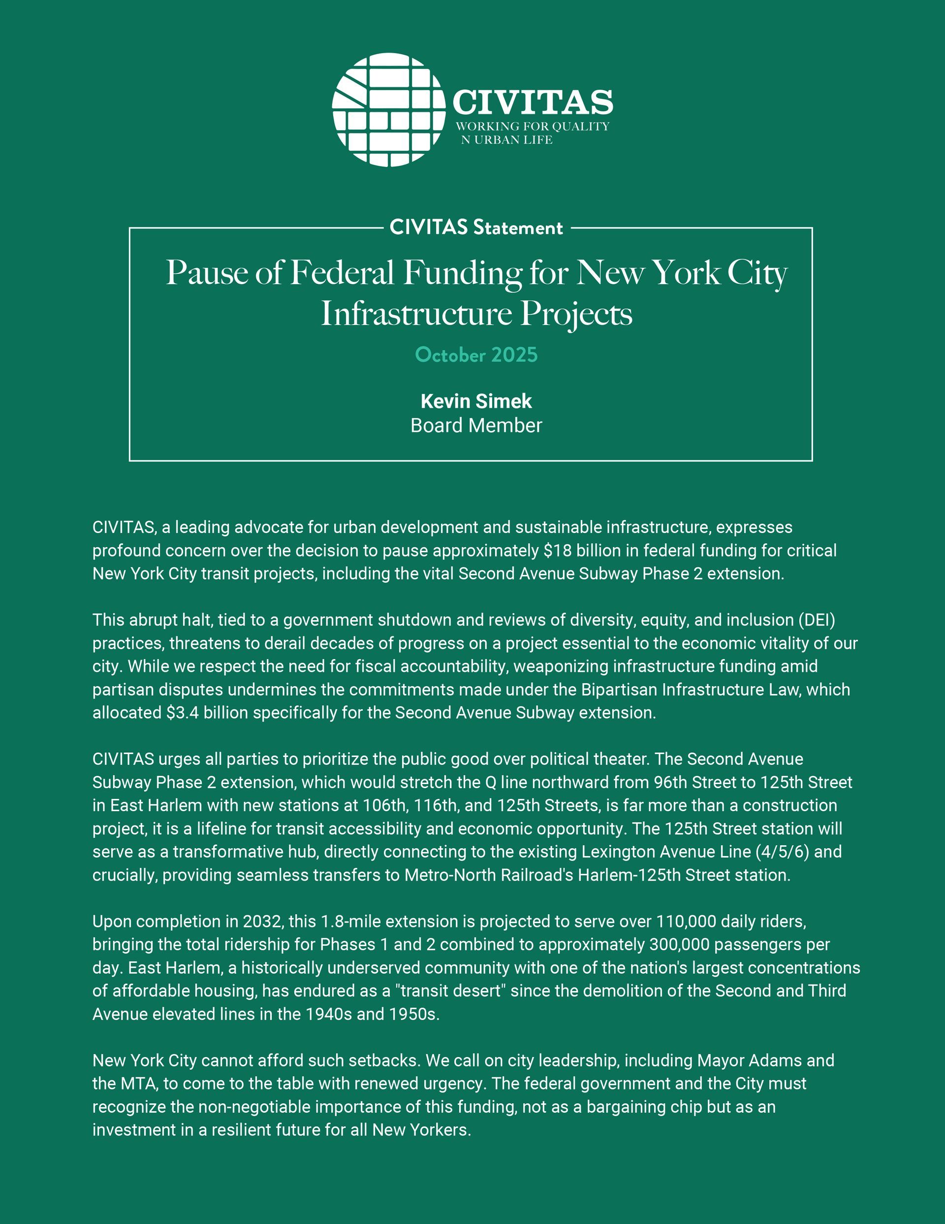 At CIVITAS, we're dedicated to promoting efficient and accessible public transportation, emphasizing the importance of safe pedestrian conditions for accessing transit options and neighborhood amenities. Our mission involves working towards a transportation infrastructure that is both seamless and user-friendly, advocating for improved subway and bus services while prioritizing pedestrian safety and convenience.