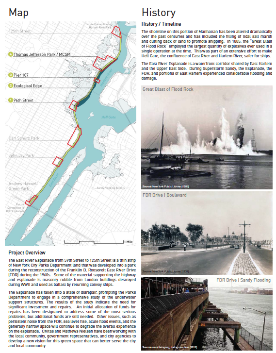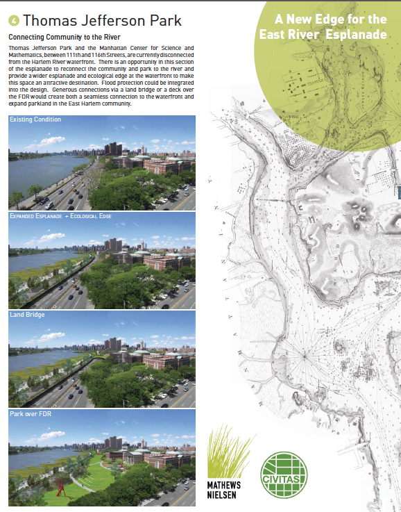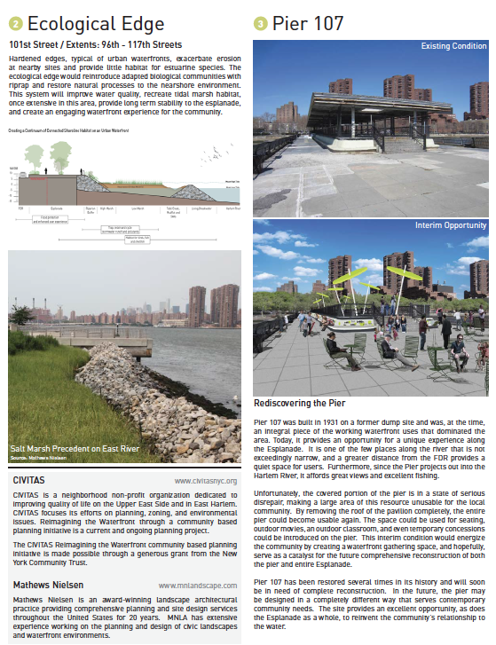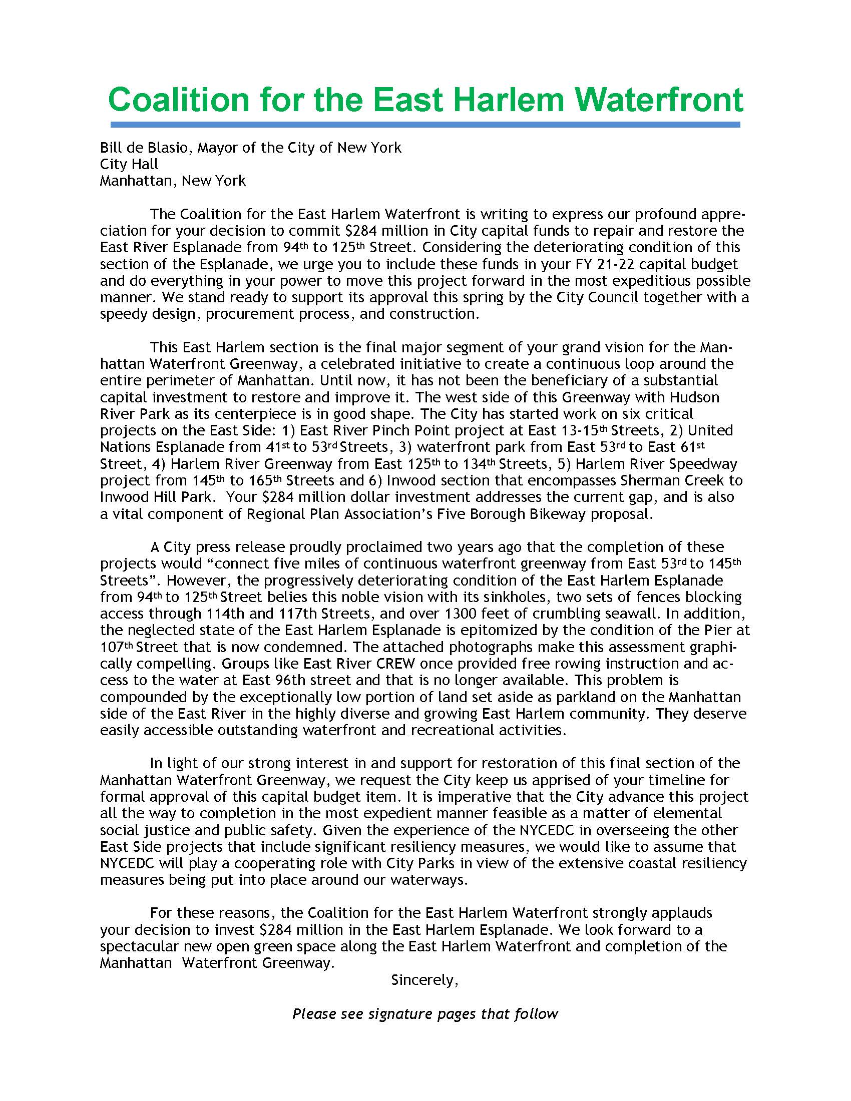 The Coalition for the East Harlem Waterfront, a coalition of 25 civic organizations recently initiated and led by CIVITAS and Esplanade Friends, is sending a letter to Mayor de Blasio today thanking him for his commitment to invest $284 million, in addition to $75 million already committed, in rebuilding and improving the East River Esplanade from 94th to 125th Streets. A set of photographs accompanying the letter displays graphically the decrepit condition of this section of the Esplanade with sinkholes, a condemned pier at 107th Street and hard barriers blocking access to three blocks from 114-117th Streets that puts a lie to the vision of a continuous functioning Manhattan Waterfront Greenway. The message of the letter is that, given these circumstances, the Mayor and City Council should include these funds in the forthcoming capital budget and pursue ways to fast track the repair and rebuilding of this segment, including the collapsing pier at 107th Street. The neglect of this section that could otherwise provide much-needed recreational access for the East Harlem community is a profound social injustice.